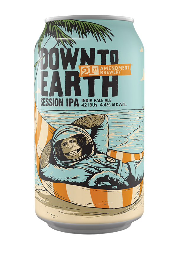 Down to Earth is the natural evolution (pun intended) of Bitter American, our original session ale. We thought it would be fitting to bring our space chimp home and let him chill. Down to Earth is available year-round in 6 pack cans and on draft and pairs nicely with a variety of things, including lunch.